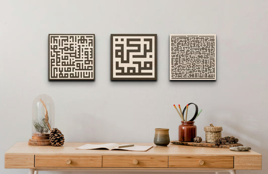 Square Kufic Wood Print Set of 3 - Ayat Ul Kursi, Baraka Muhammad, and Qur'an (33:56)