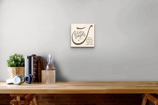 Wood Print Calligraphy - Ready to hang or display on shelf - "Nuun Walqalami Wama Yasturoon" - "Nuun - I swear by the pen and what the angels write!" - Minimalist Design